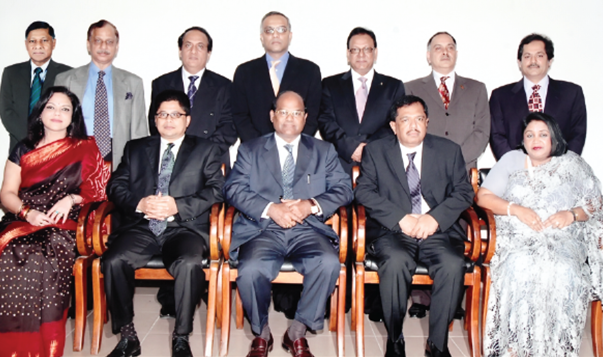 Sitting L to R-Dr. Misbahul Alam Khan, Director, Mr. Matiur Rahman Chowdhury (Dulal), Director Administration, Mr. Showkat Aziz Russell, President, Mrs. Tahmina Rehman, Director Finance, Dr. Md. Wahiduzzaman (Tamal), Director.